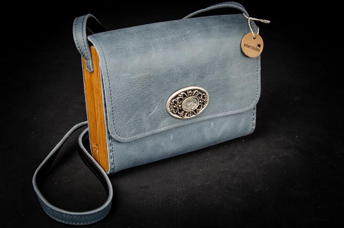 Holz/Leder Kombination mit verstellbarem Trageriemen.