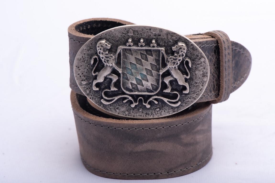 Handgefertigter Rindleder – Trachtengürtel mit Koppelschließe Bayernwappen in Altsilberoptik. Die ovale Schließe ist in angesagtem Antikstil gefertigt – ein Muss für jedes Fest, passend zu jeder Lederhose, Trachtenhose und natürlich auch zur Jeans. Hinweise zur Ermittlung der Gürtellänge finden Sie hier….